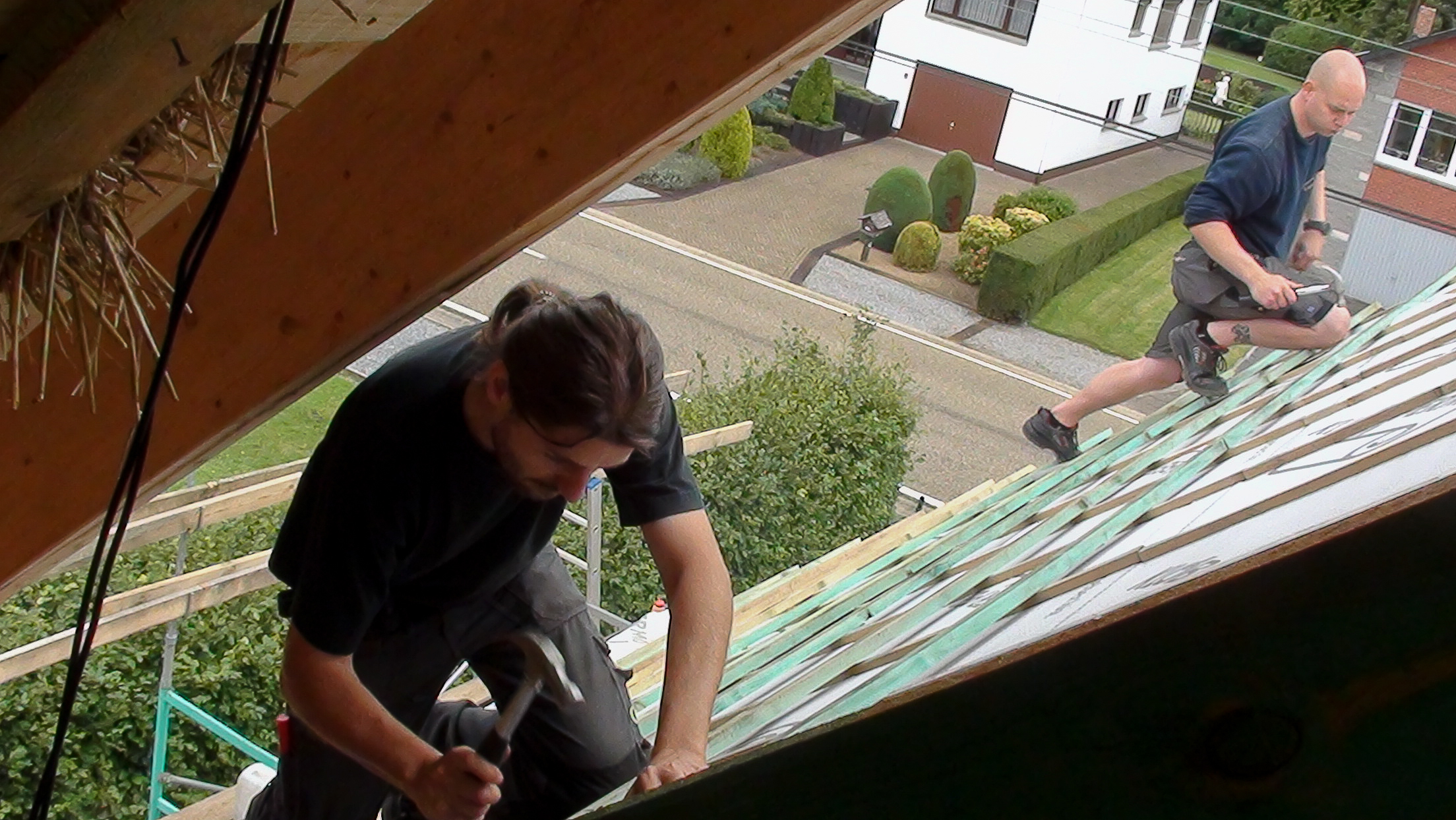 Het lood wordt uitgerold over de pannen en omgeplooid tegen de muur om te voorkomen dat er water achter de pannen in loopt en de muur binnen dringt.
