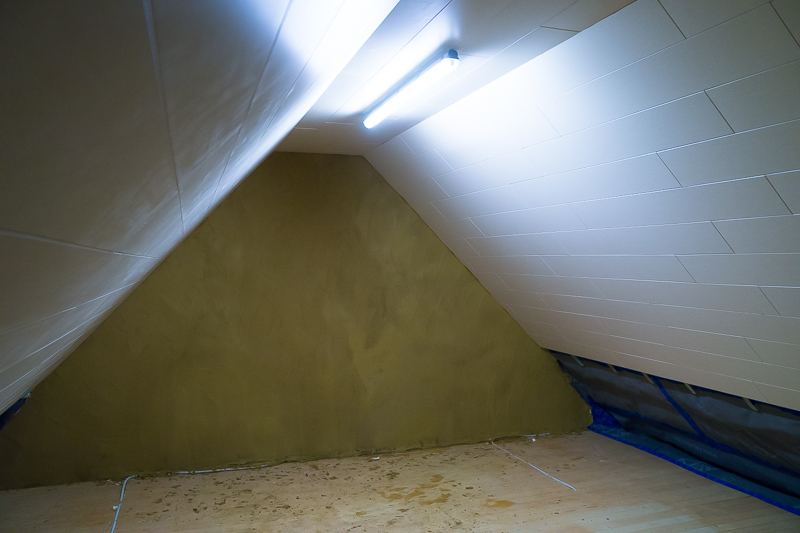 - De achterste muur werd door Eefje netjes van een tweede laag leem voorzien die perfect aansluit aan het plafond.