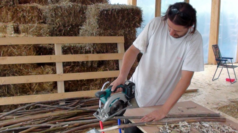 Na de middagpauze gaat Eefje aan de slag om ons materiaal weer in de camionette te laden (het blijft immers onze “mobiele werfkeet”). Daarna begint ze met het op lengte zagen van de wilgentakken en deze van een scherpe punt te voorzien. Met de hakbijl is dat best zwaar werk. Bij het opbouwen van de stromuren worden deze takken gebruikt om de strobalen in verband te houden. Morgen kom ik hierop nog in detail terug.